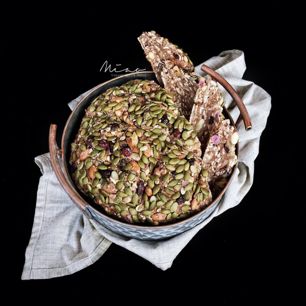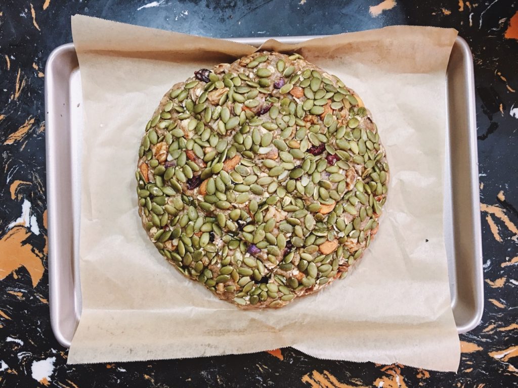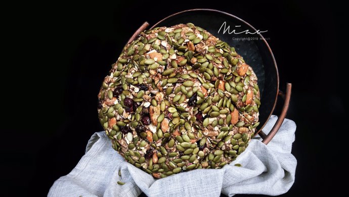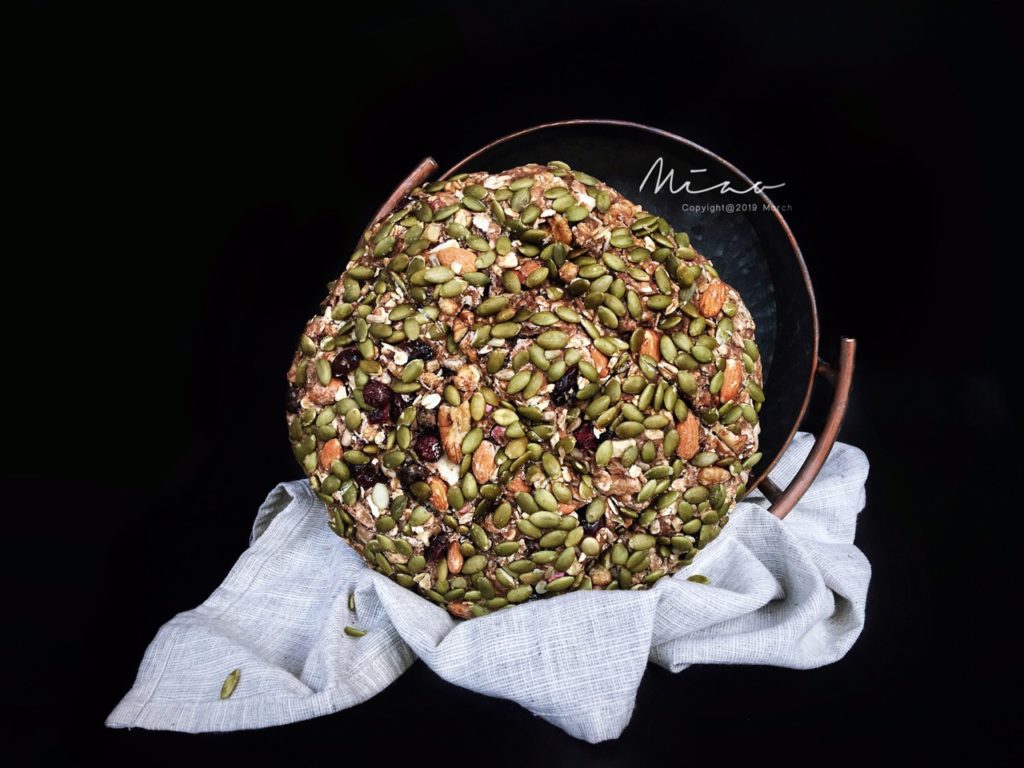 4、烤箱預熱上下火200度,中層烤制30-35分鍾,喜歡酥脆口感的可以等面包涼透切片,180度、烤15分鍾左右,吃起來就跟意式脆餅一樣的口感,因爲都是粗糧跟堅果烤的時候只會膨脹一點,乘熱吃也是超級好吃的。