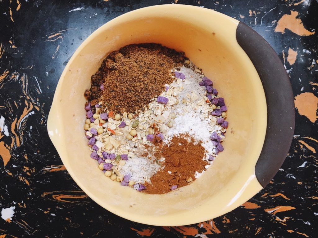 1、褐麥粉,黑麥粉,燕麥片、泡打粉、豆料包、肉桂粉、鹽、紅糖,全部稱好