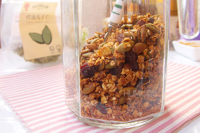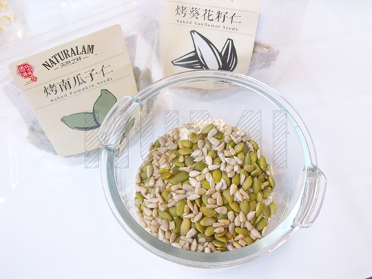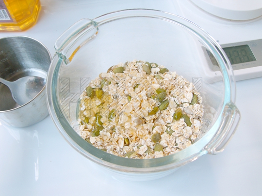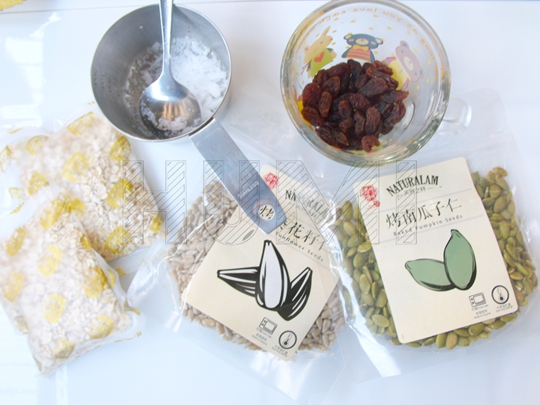 燕麥片70克、南瓜子(炒)30克、葵花籽20克、葡萄幹30克