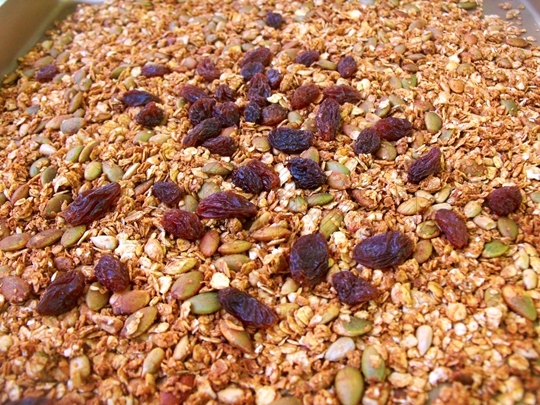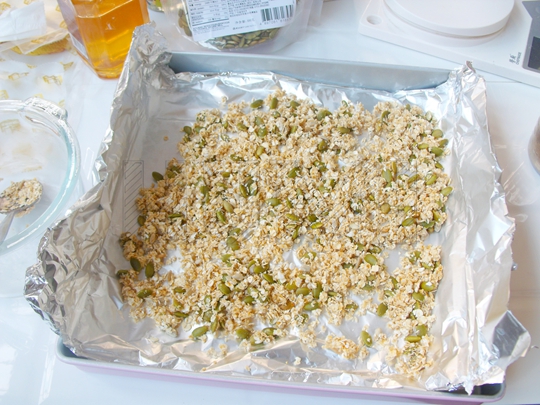 5、鋪在烤盤上,入烤箱150度烤5分鍾,翻拌一次,轉110度烤20分鍾左右,途中開烤箱翻拌一次,加3~5分鍾