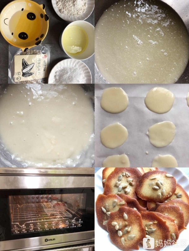 准備食材:蛋清50克、食用油50克(無味的哦!)、糖粉40克(根據自己的口味適量增減)、葵花籽適量、低筋面粉50克