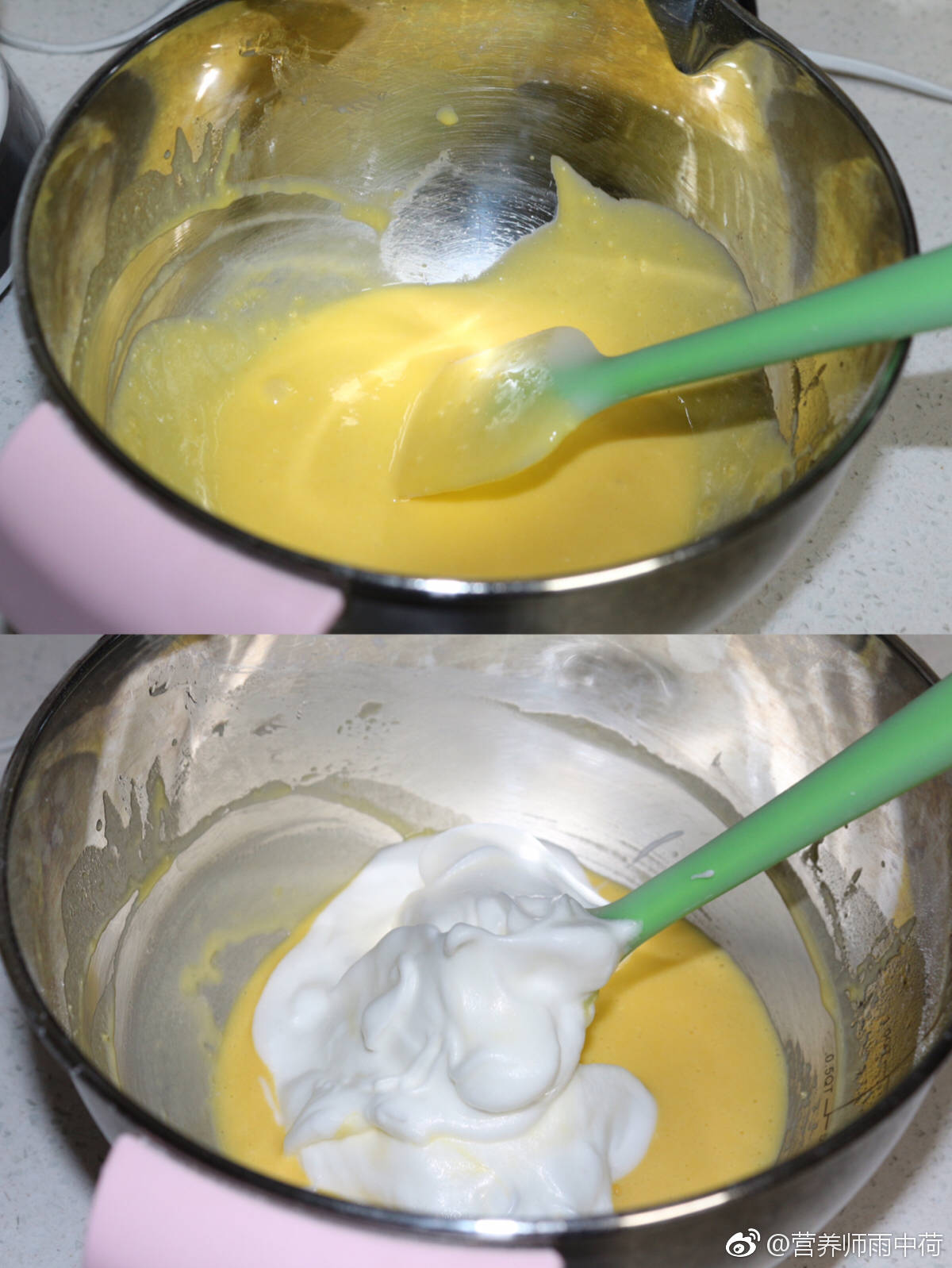 3、 分離蛋清蛋黃,蛋黃內加入水、油攪拌均勻,過篩面粉和澱粉繼續攪拌均勻;