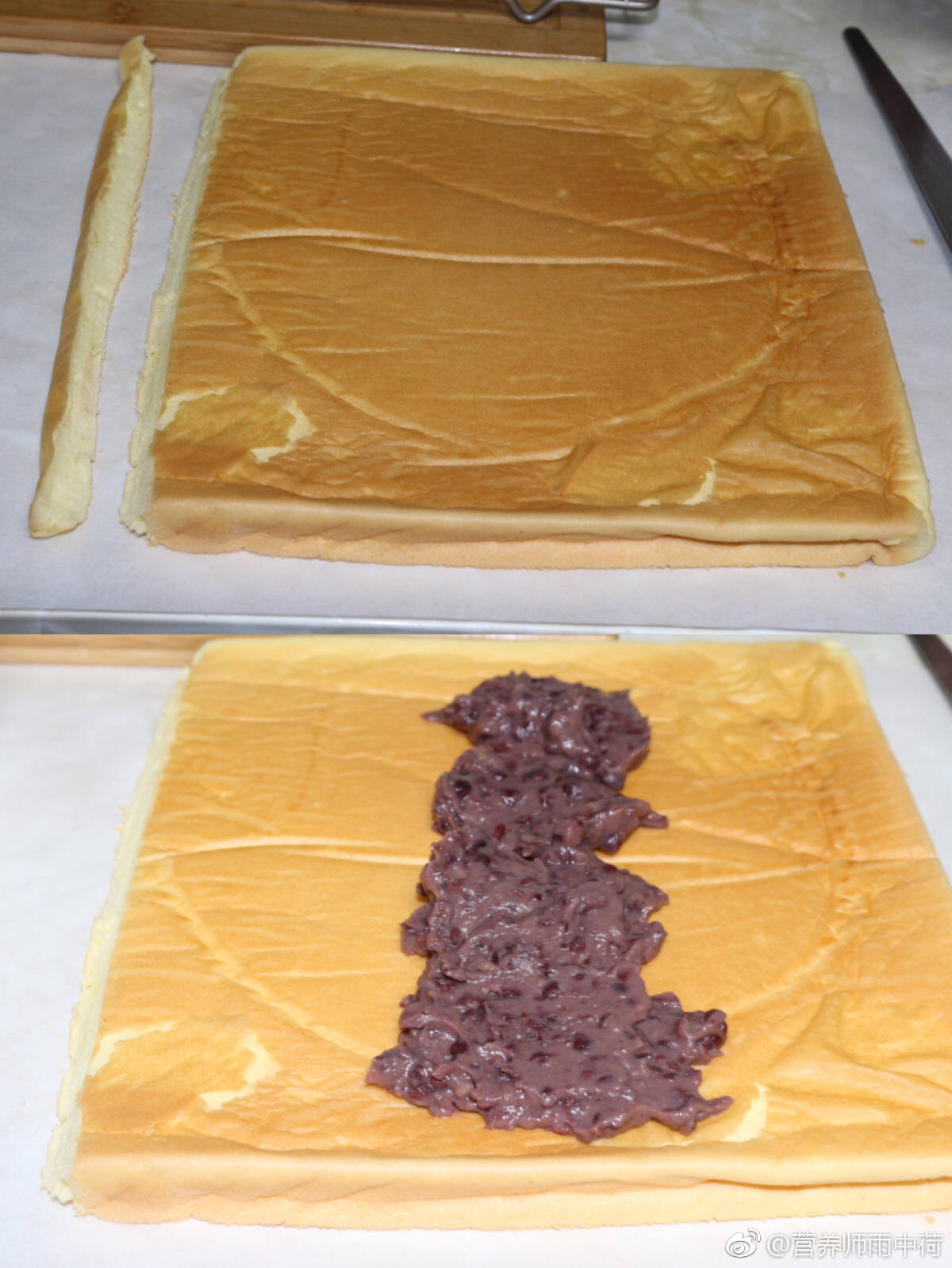 8、 將蛋糕卷一側斜切一刀,另一側直切一刀,這樣做是爲了方便蛋糕卷卷起來,將豆沙放在蛋糕卷上,用刮刀攤開,要卷的這側空余出2厘米且這面的豆沙要多一些,這樣做也是方便蛋糕卷卷起來,且漂亮,