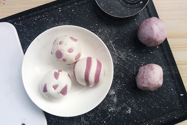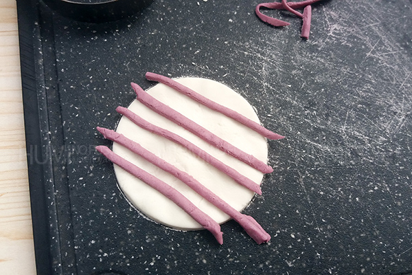 3.紫色面團做成長條的圖案,或者圓點和三角形,貼在白色面團上。