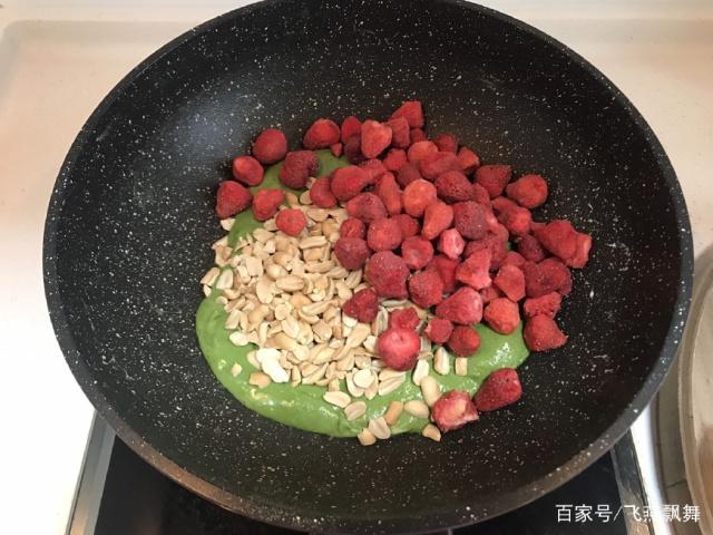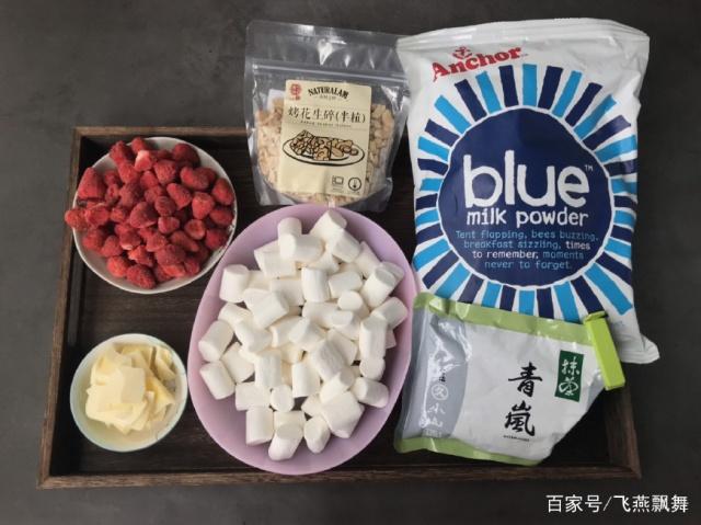 原料:棉花糖180克,黃油35克,奶粉90克,抹茶粉8克,天然之林烤花生碎120克,無糖整顆草莓脆50克(如果有糖草莓脆多加30克)