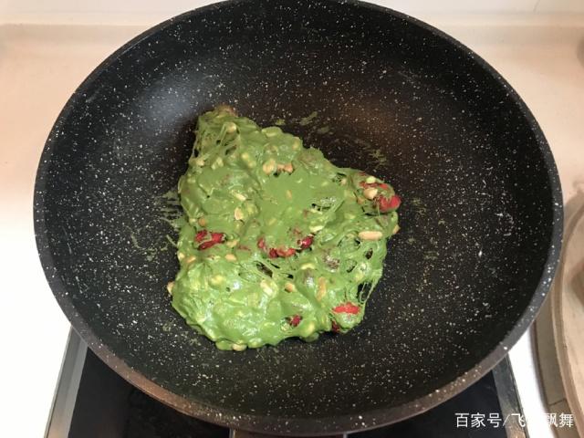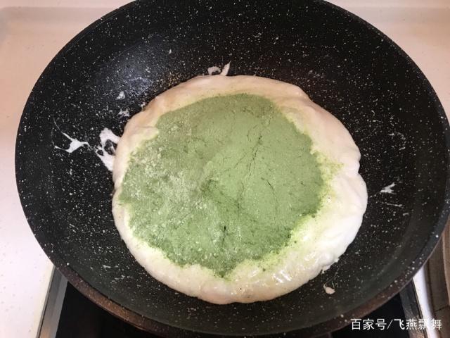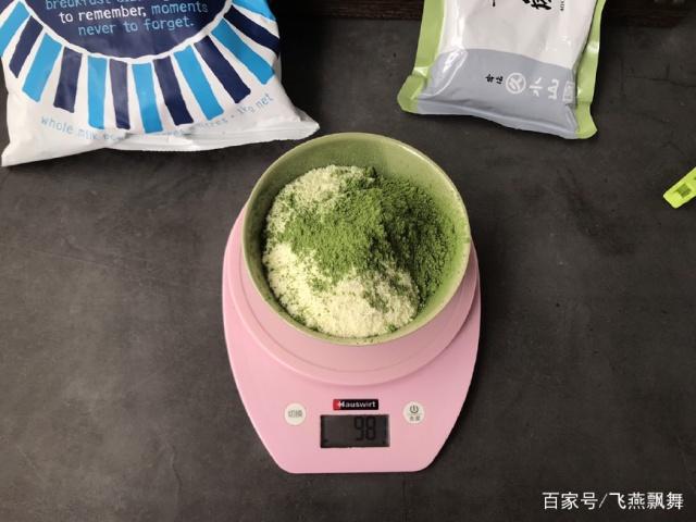 7、放入奶粉和抹茶粉,快速翻拌均勻後關火。