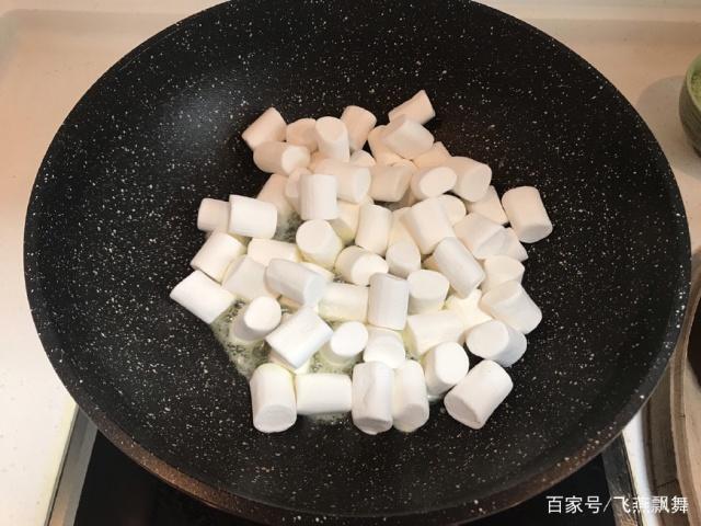 6、來回攪拌至棉花糖融化,如果想吃硬點的此時多炒一會兒,想吃軟一些的棉花糖融化了就放入奶粉混合物。