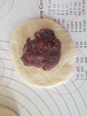 9、取一個小面團,擀開,包上栗子紅豆餡團。