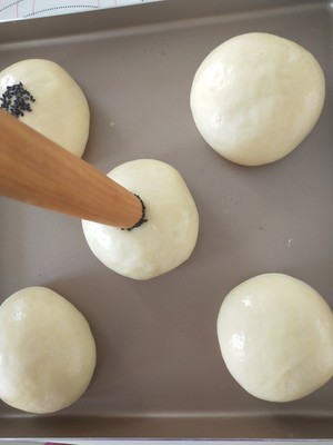 12、發酵結束後面團表面塗全蛋液,用擀面杖一頭沾水,再蘸芝麻,輕輕壓在面團中間。