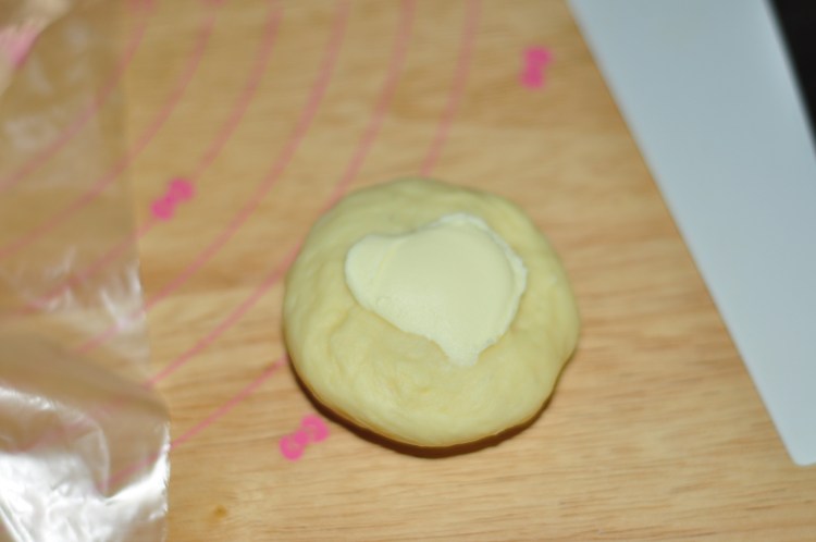 8、面團按扁,抹上奶油奶酪。