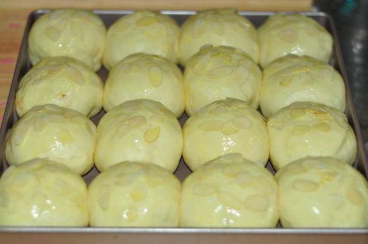 12、發好取出刷一層蛋水液,撒上杏仁片。