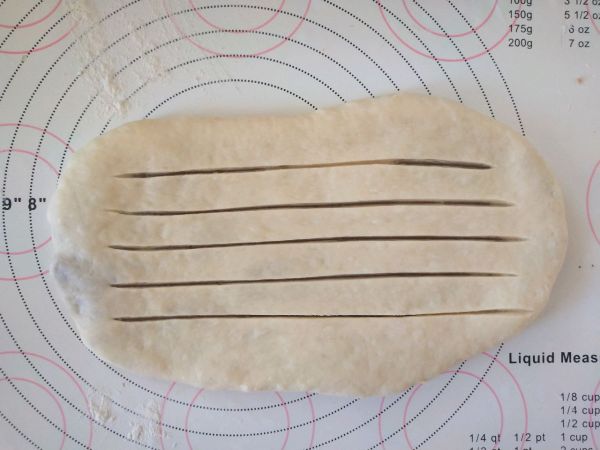 8、擀成橢圓形,用刀片劃出4、5道口。