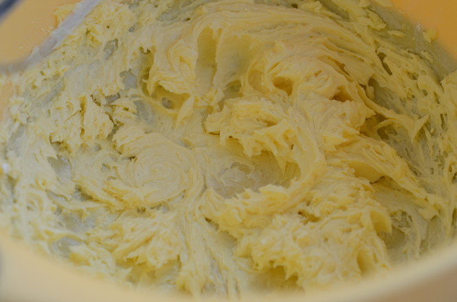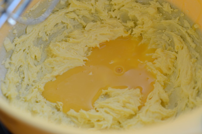 2、黃油室溫軟化,加糖粉打至發白,加蛋液