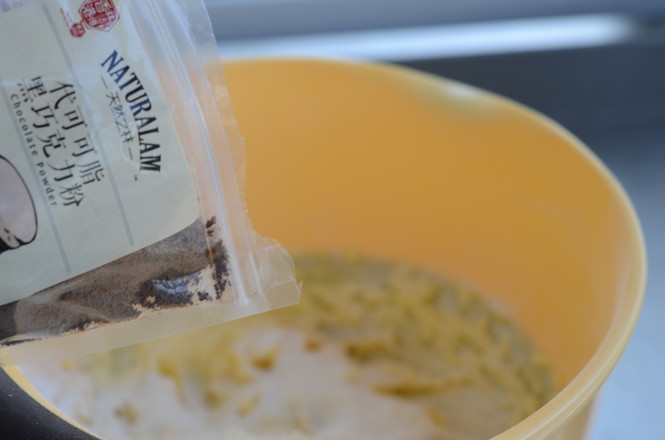 4、篩入低筋面粉、杏仁粉、天然之林黑巧克力粉