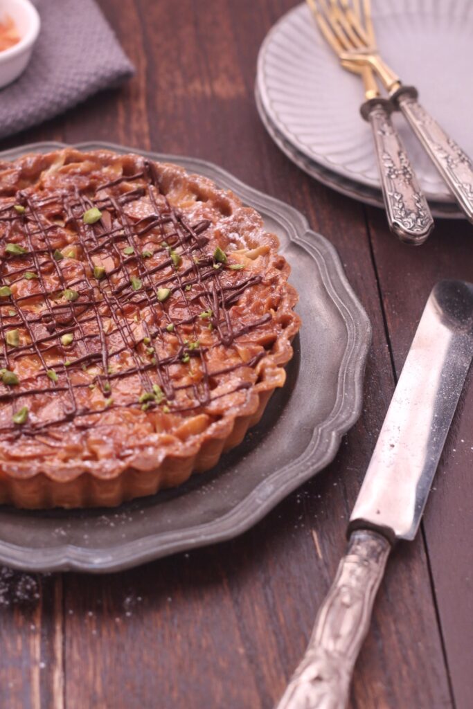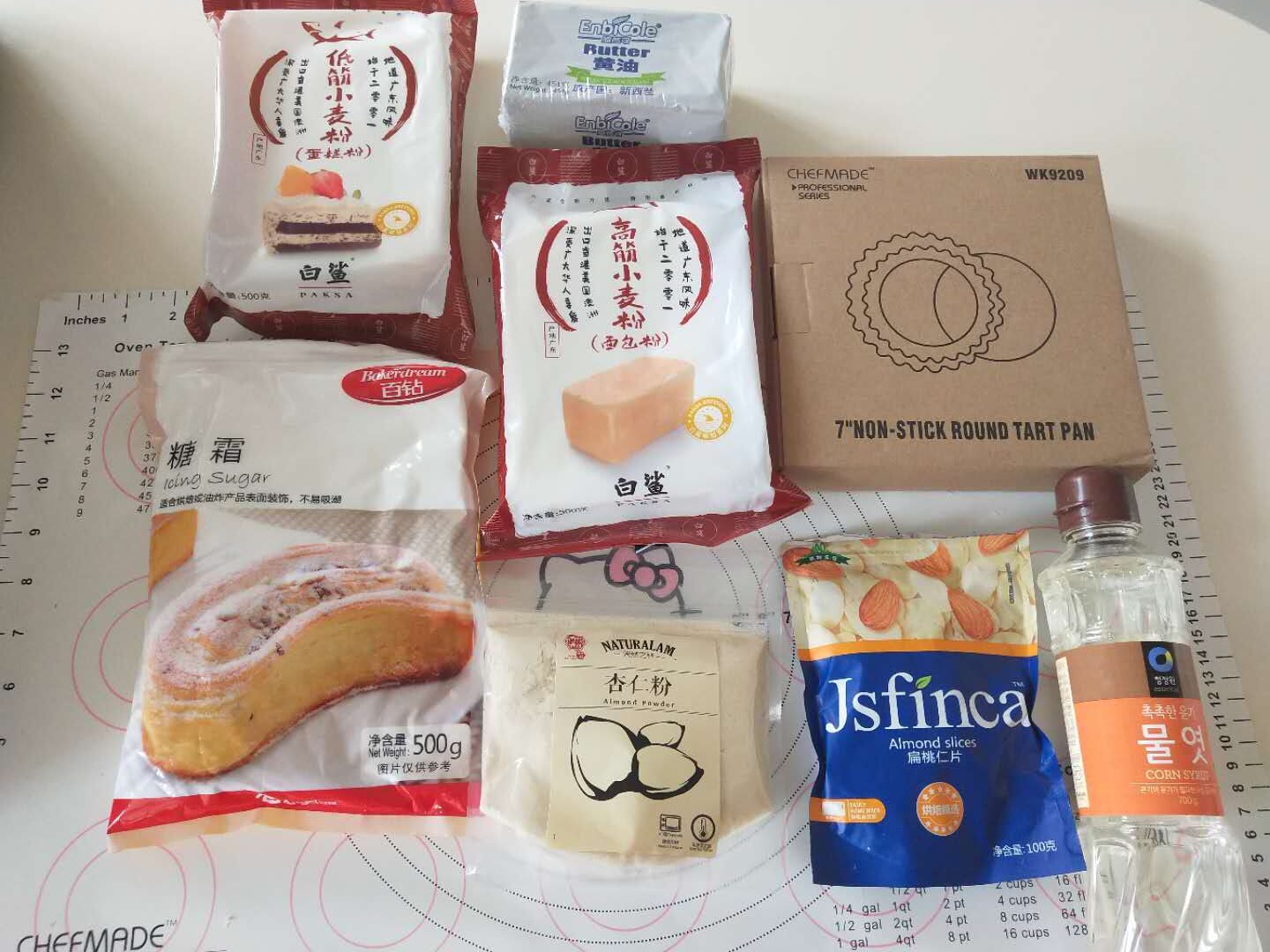 天然之林杏仁粉、高筋面粉65克、低筋面粉10克 、天然之林杏仁粉13克、糖粉20克、鹽1克、黃油 40克 全蛋液 15克、奶油杏仁巧克力餡、黃油25g、糖粉25克、低筋面粉3克、全蛋液25克、耐高溫巧克力豆25克、朗姆酒1瓶蓋、淡奶油40克、黃油24克、細砂糖 32克、蜂蜜 16克、杏仁片60克、玉米糖漿16克、融化巧克力適量、開心果適量。