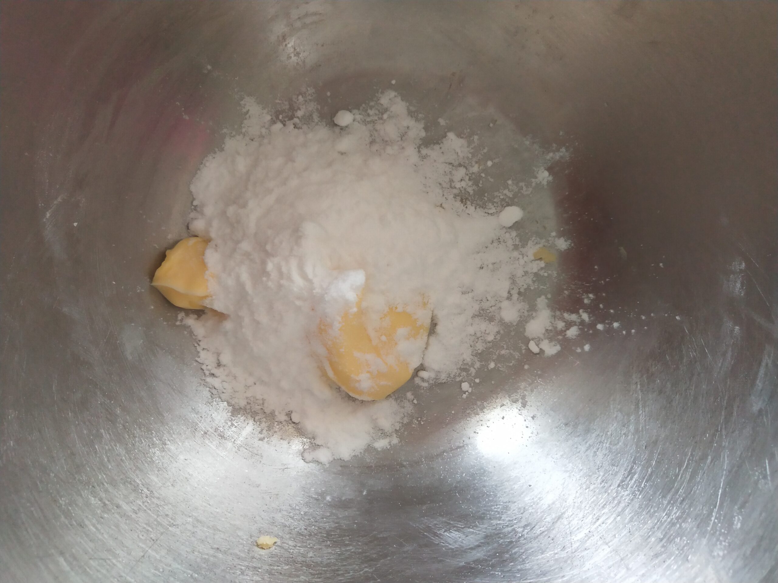 2、黃油軟化加入糖粉、鹽翻拌均勻。