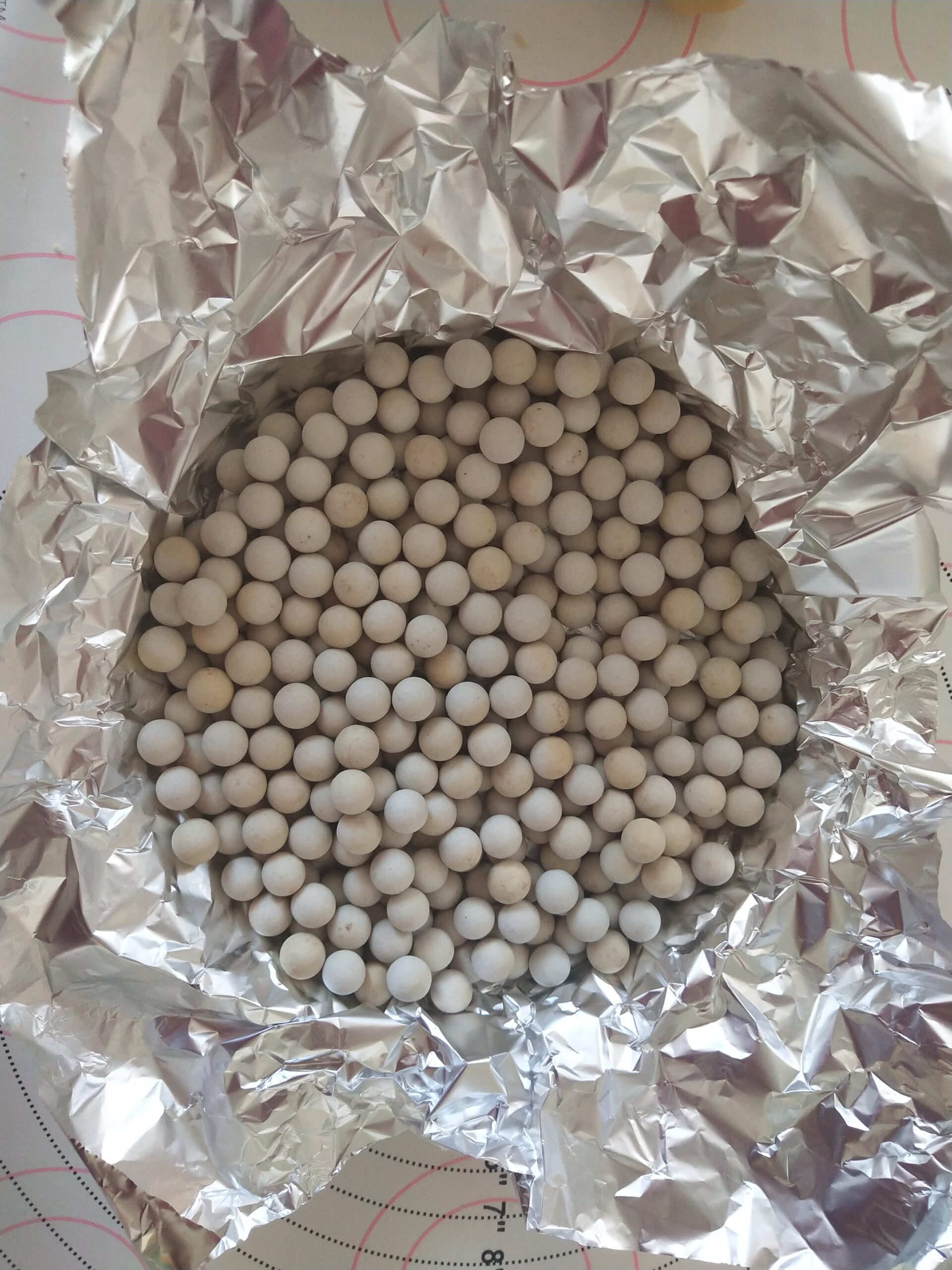 13、蓋上錫紙倒入烘焙石,烤箱中層150度烤15分鍾,取出把烘焙石去掉,150度烤10分鍾。