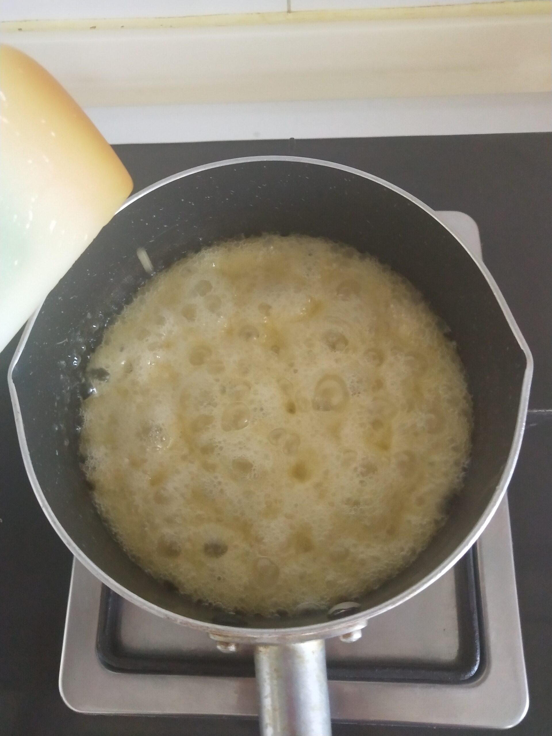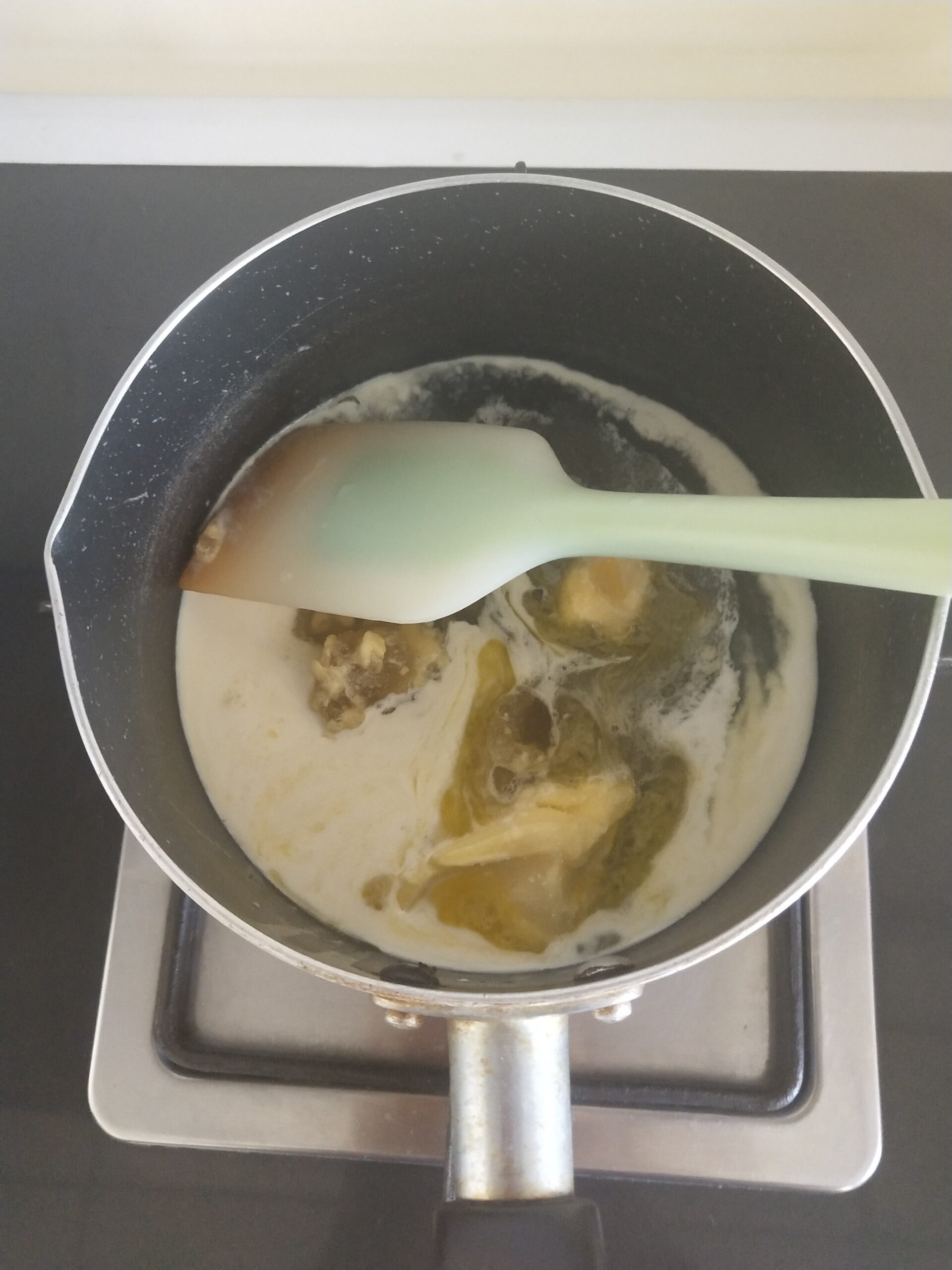 16、制作焦糖杏仁糖:淡奶油、黃油、砂糖、蜂蜜、玉米糖漿入鍋加熱攪拌.
