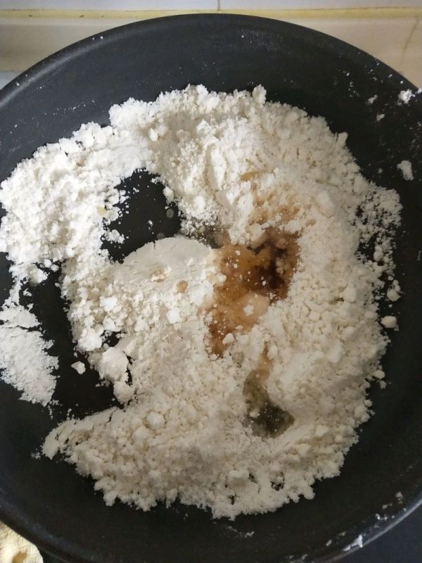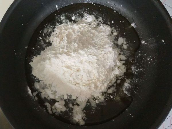 8、這個時候可以做五仁餡。平底鍋中放內餡材料裏的油,低粉,檽米粉小火炒到微黃,用熟檽米粉更好,不用炒太久。