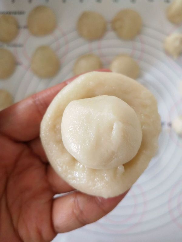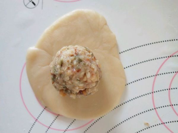 19、擀成圓,包入內餡。收緊封口。