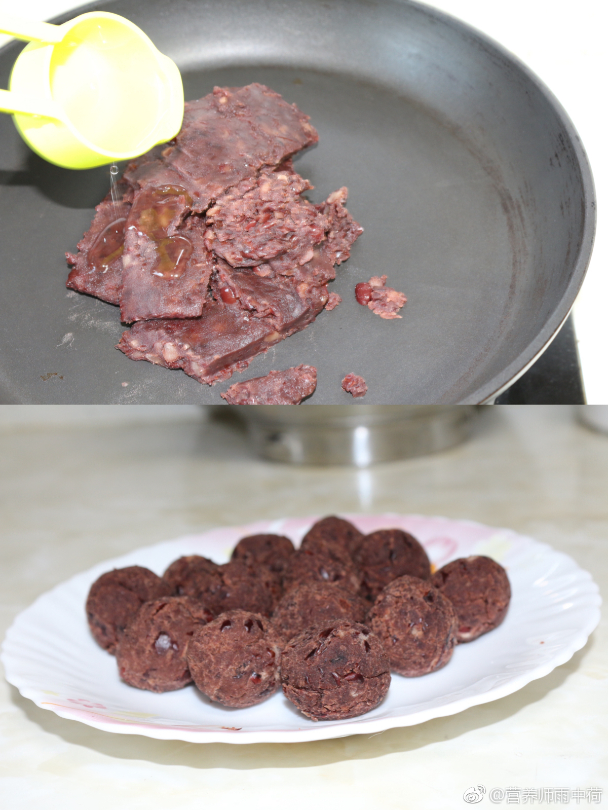 7、不粘鍋內倒入玉米油和紅豆餡,小火翻炒至光滑不粘手爲止;