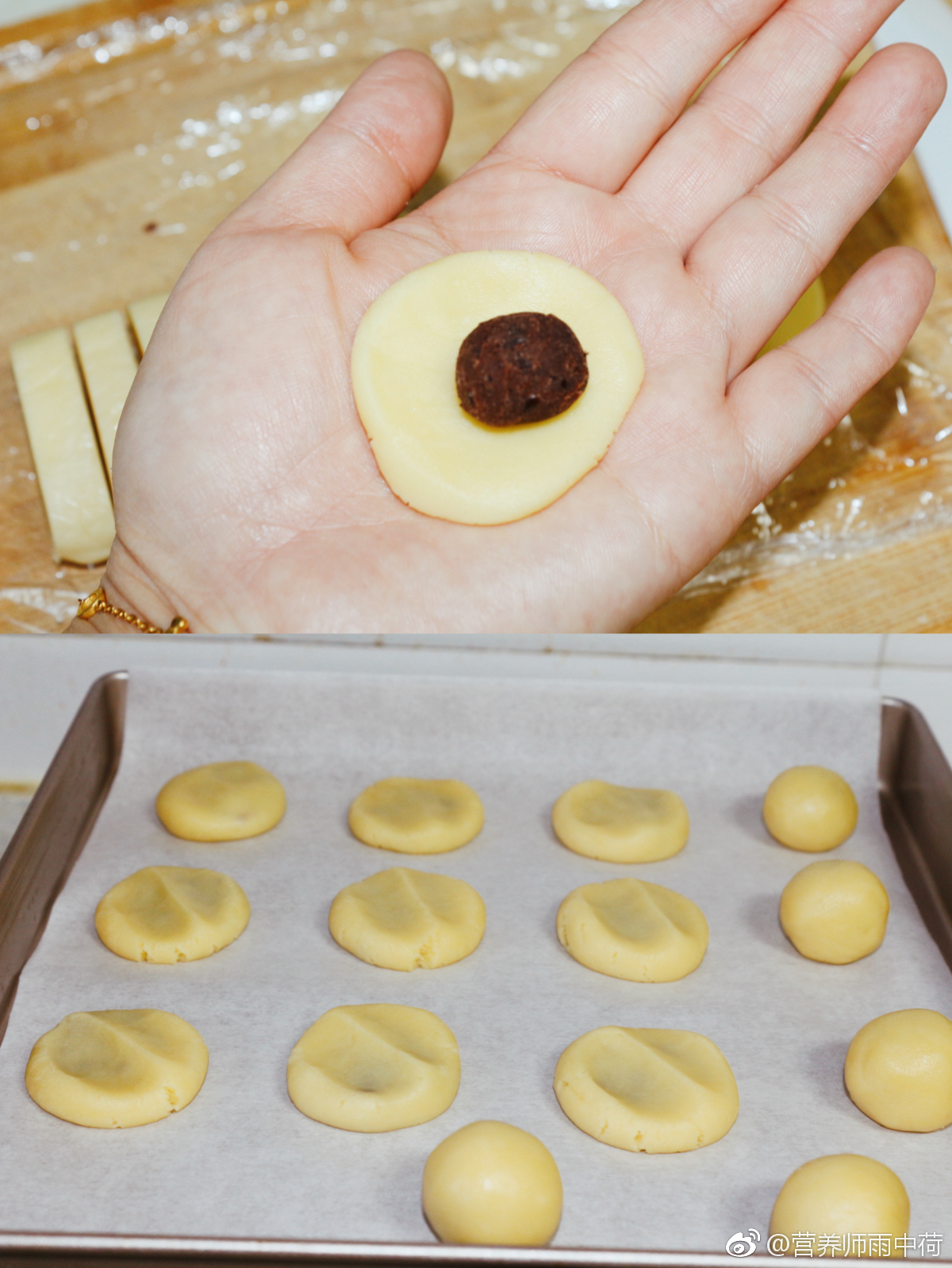 11、把豆沙與面團包好,按扁放在烤盤上;