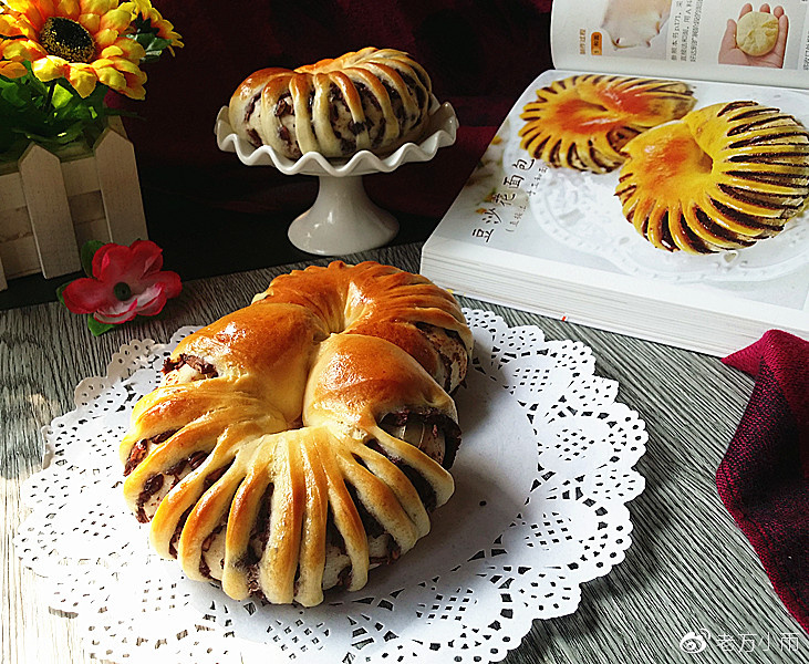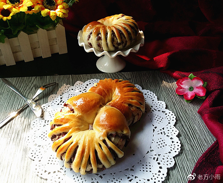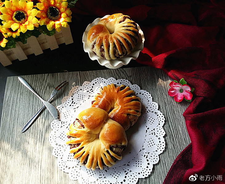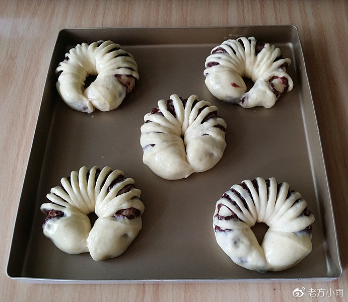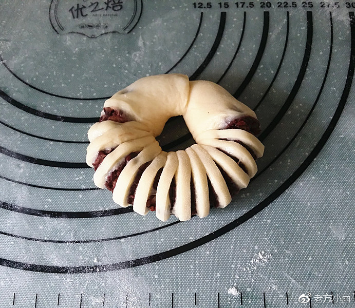 9、再將兩端繞成環狀,收口交接捏緊,一個豆沙花面包坯就做好了