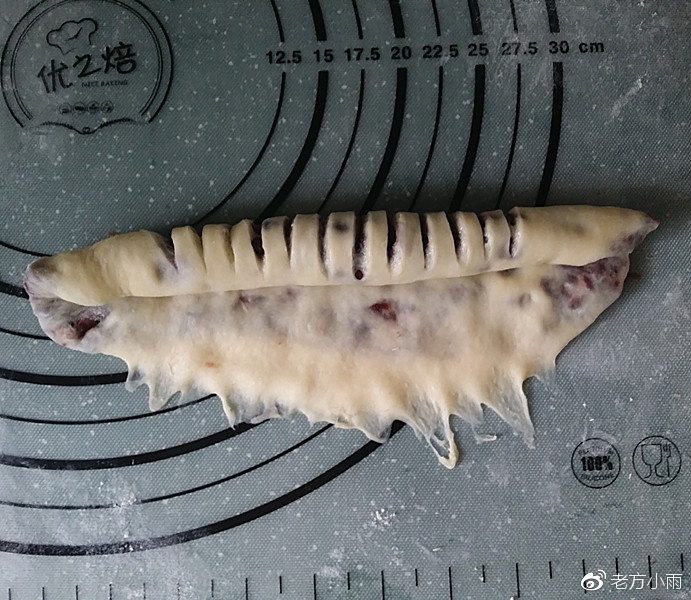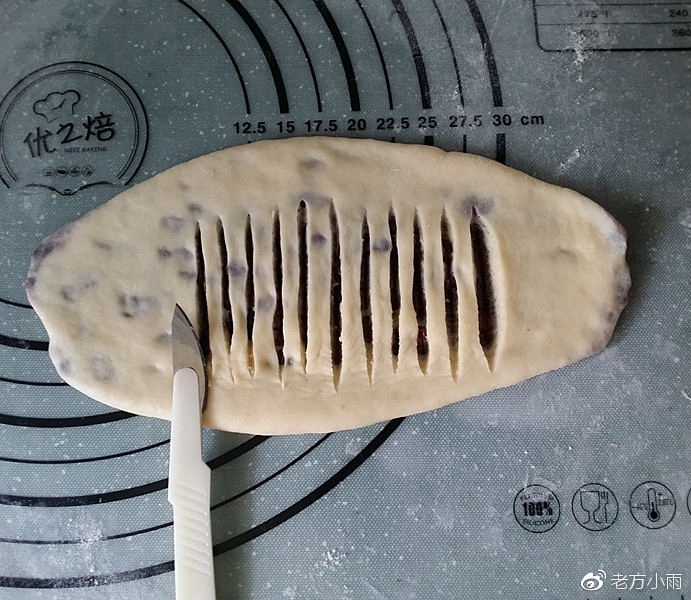 7、用手先輕輕按扁、再用擀面仗擀成橢圓形,接著用鋒利小刀在中間劃開N條刀口、但不要劃破下面的面皮