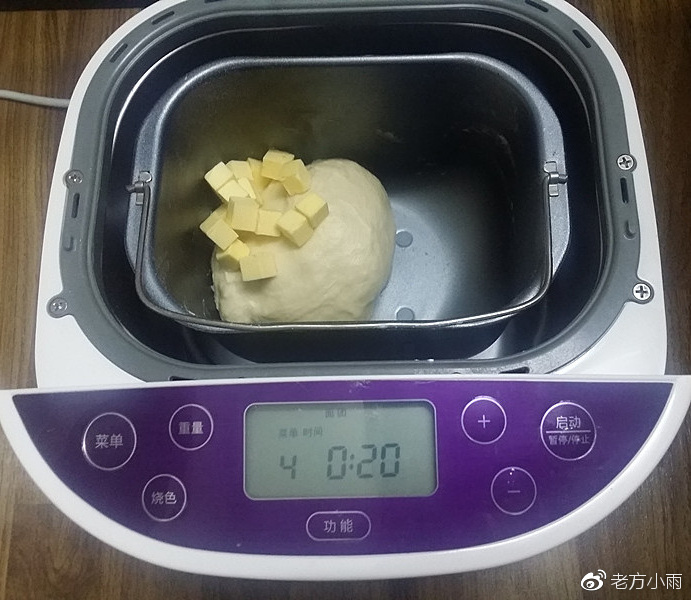 材放入面包桶,啓動揉面程序、結束後加入軟化的黃油粒繼續;若沒有面包