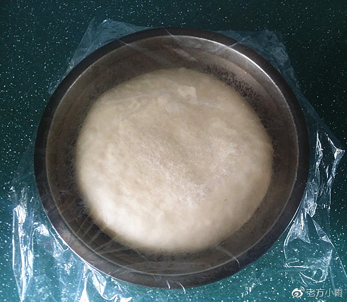 3、面團揉好後將面團重新團圓、蓋膜采用適合自己方法發酵至2.5倍大