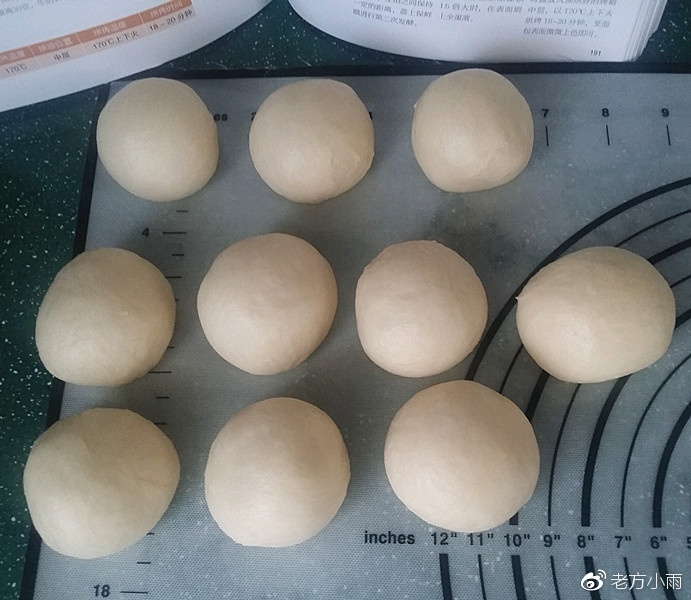 4、取出發酵好的面團、排氣後分割10等份、再搓圓蓋膜松馳15分鍾