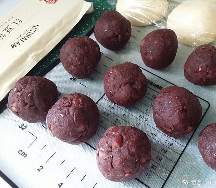 5、此時再將備好的:紅豆沙分割10等份搓圓備用;有時間的樣也可以自己熬制紅豆沙,當然時間少的親也可以跟我一樣買現成的紅豆沙了