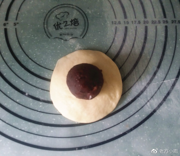 6、取一發酵好的面團壓扁、包入一個豆沙球、收口朝下