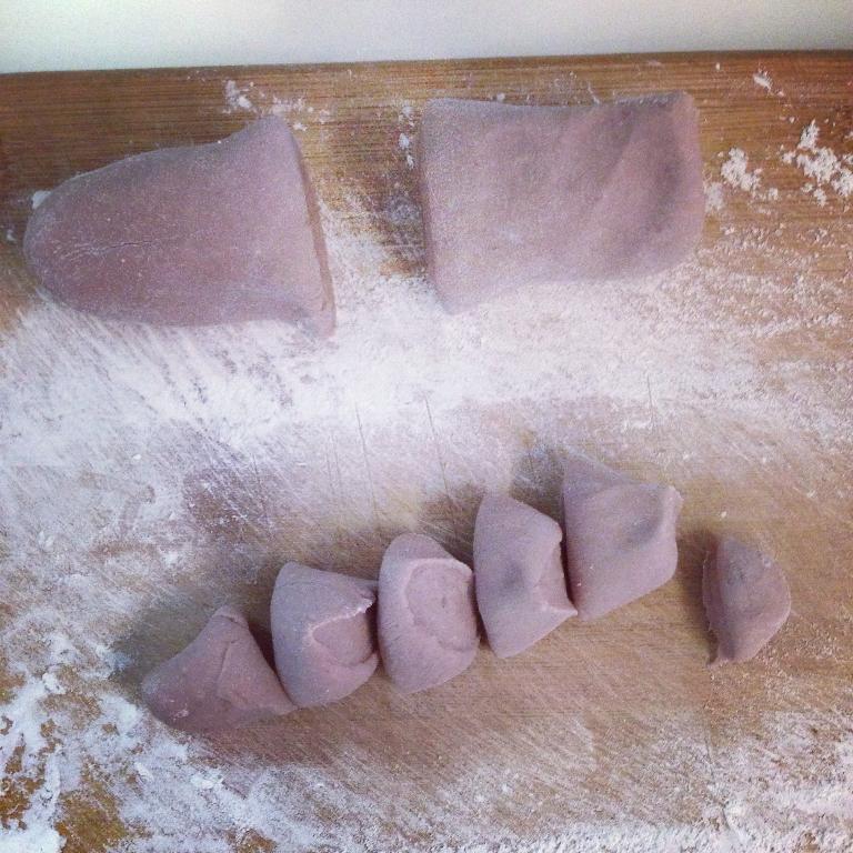 用紫薯蓉和南瓜蓉跟麵粉揉合,然後用來作各式花式麵點。