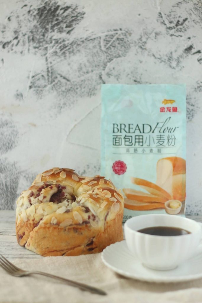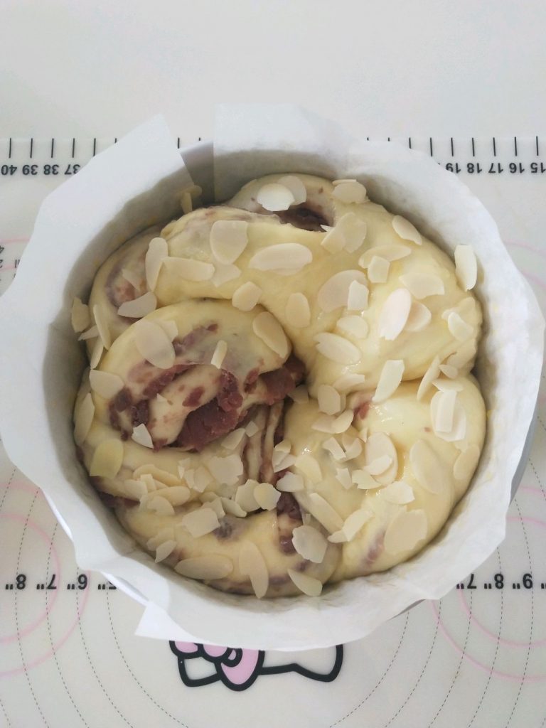 12、發酵到模具的8分滿。表面刷全蛋液,撒適量杏仁片,烤箱下層 200度 烘烤20-22分鐘。上色及時蓋錫紙,