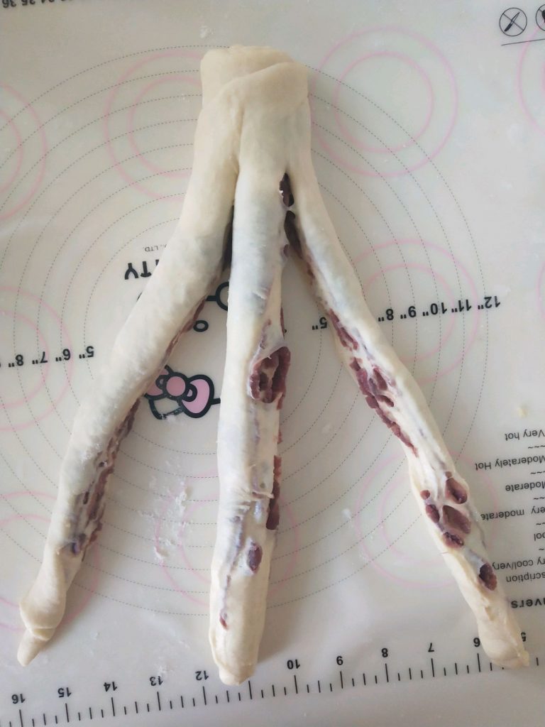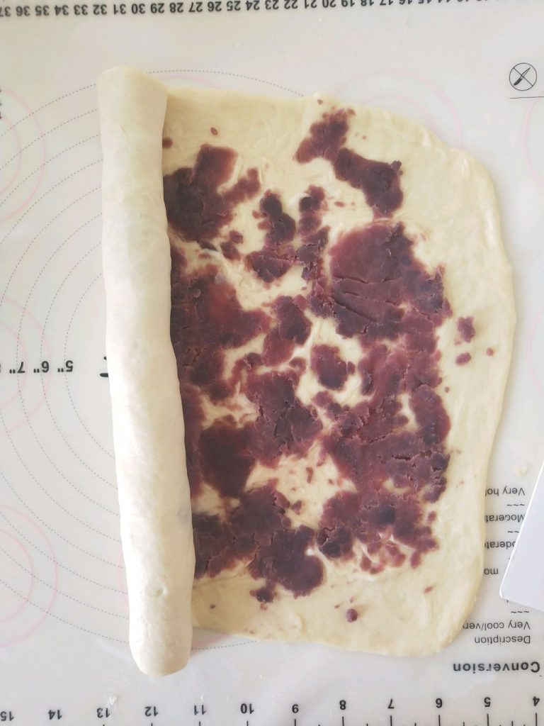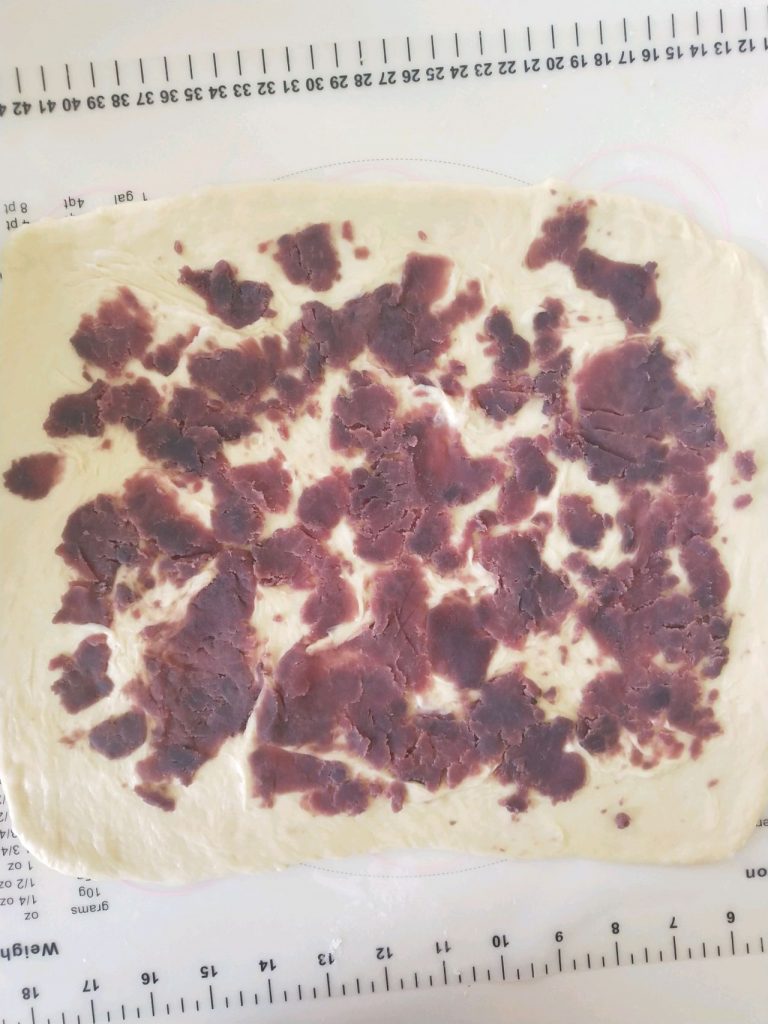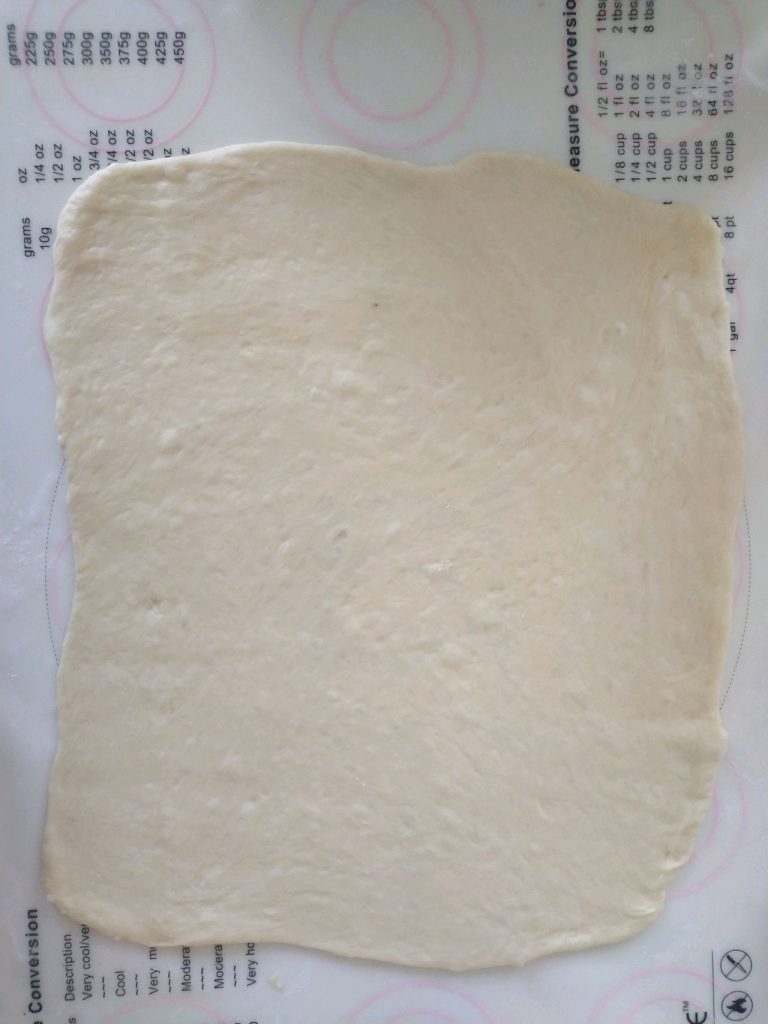 6、取出發酵好的面團,搟成30*35厘米的面片。