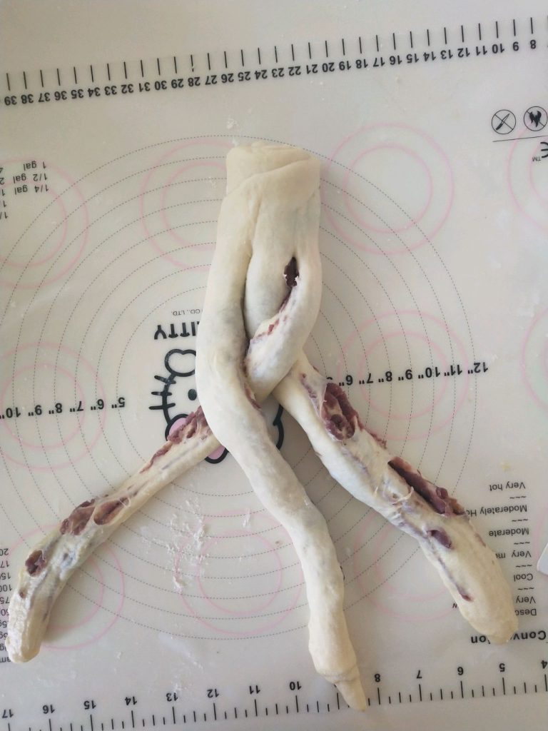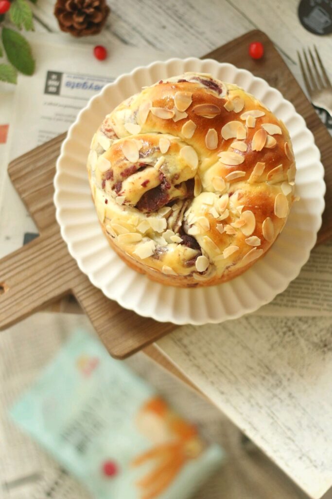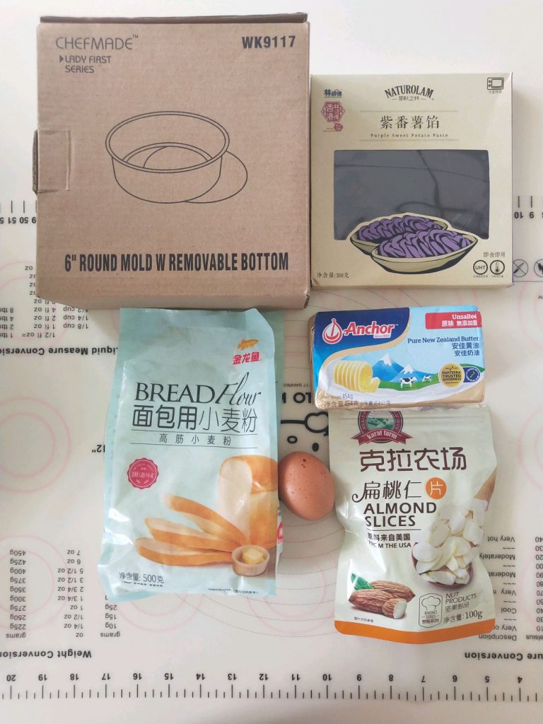 面包專用小麥粉200克、那秋之林紫薯泥、全蛋液30克、水90克、鹽2克、酵母25克、黃油20克、細砂糖20克、夾餡材料120塊、杏仁片適量、全蛋液少許