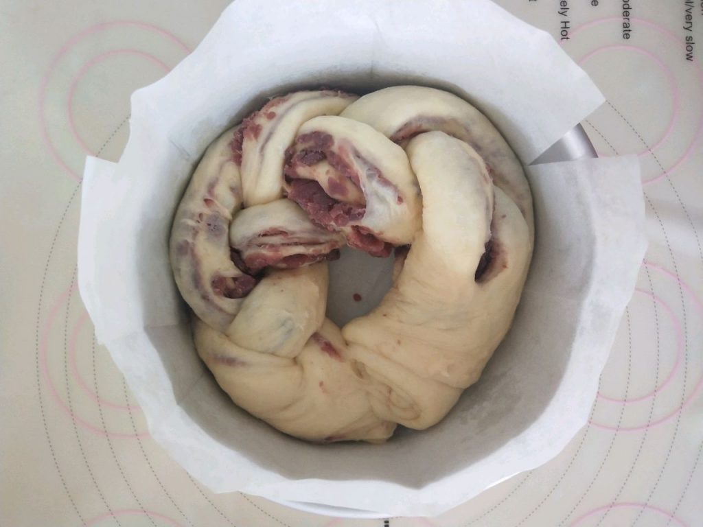11、學廚6寸活底圓膜底部和四圈放油紙,將面團首尾相連,放入模具中。進行二次發酵。