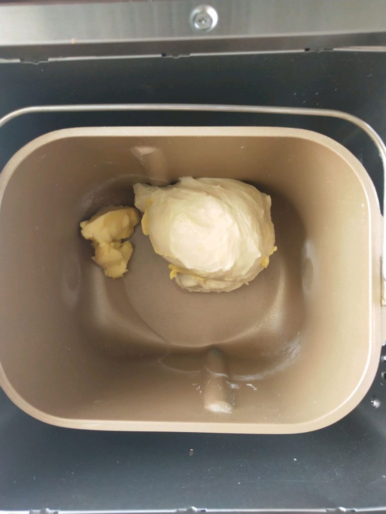 3、揉10分鐘後加入軟化的黃油繼續揉。