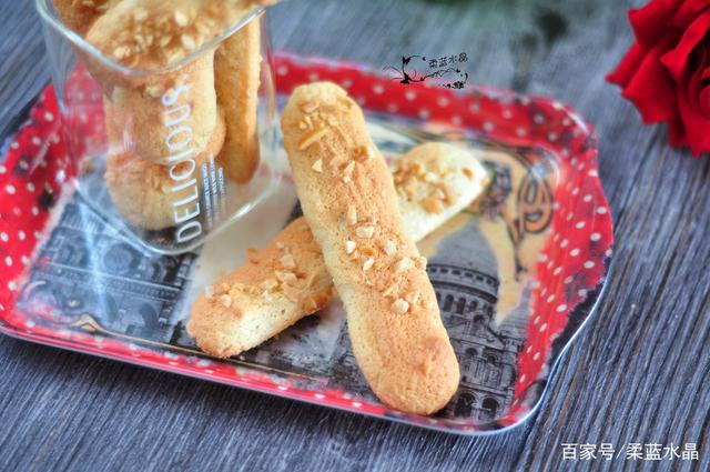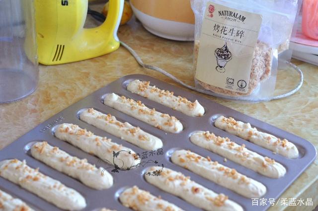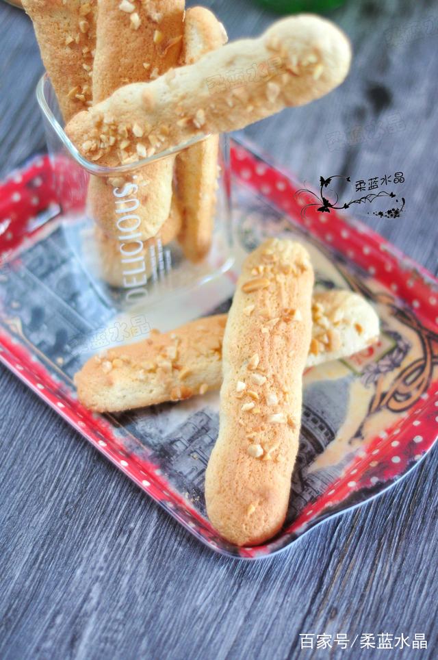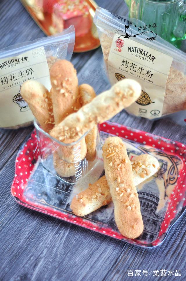 手指餅因爲造型是是細長條的,有點像手指而是得名,說是餅,其實還是一種蛋糕,因爲它是蛋糕的做法。 手指餅經常用來做提拉米蘇,但其實你們不知道的是,用花生粉代替一部分低筋粉,表面再加了花生粒以後,烤出來的手指餅比做提拉米蘇更好吃。跟以前吃過的手指餅味道真不一樣,不是戚風蛋糕那種軟趴趴的口感,又沒有餅幹那麽硬,還有著花生的香味,更有表面的酥脆口感,讓這手指餅也有了不一樣的味道。 剛出爐的口感是又香又脆,花生的香味非常濃郁裝入袋子中過一會,蛋糕就會變軟了 配料:蛋白2個 蛋黃1個 糖30g 低粉40g 花生粉30g 花生粒5g   1.蛋白裏分兩次加入糖打發。打至拉出打蛋頭有小彎鈎。 2.加入蛋黃攪幾下。 3.篩入低粉拌幾下。然後加入花生粉。 4.拌至大概看不到幹粉。 5.將面糊裝入裱花袋中。將面糊擠在手指餅幹模具中,表面撒上花生粒。 6.放入烤箱中層,160度烘烤12分鍾。出爐後晾至不燙手時,用刮板將蛋糕脫模。 注意: 1.面糊不要過度攪拌,裝面糊擠面糊也不要耽擱太久,否則容易消泡。 2.最後幾分鍾要守在烤箱前,防止表面上色嚴重。 3.直接脫模容易撕斷,用刮板沿著底部輕輕推動就能脫模了。 4.花生粒用的是現成的袋裝,也可以自己將熟花生切碎。