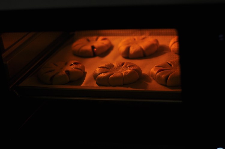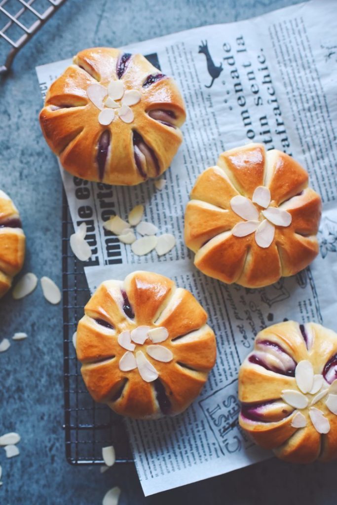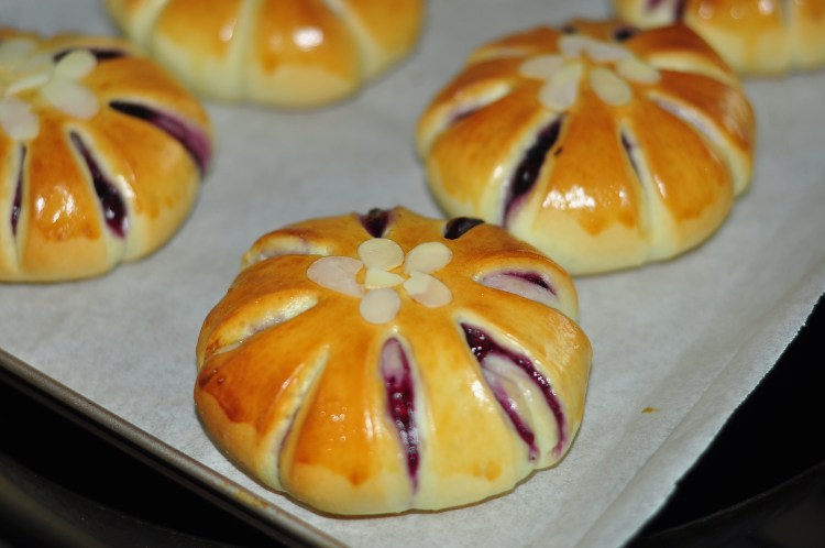 不用揉出手套膜卻特別松軟好吃的花朵造型面包,裏面是香甜有大果粒的藍莓果醬,即營養又美味 ,即使因爲生病沒有味口的我也沒有抵擋住誘惑吃了一個,哈哈。