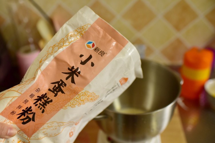 2、倒入小米蛋糕粉,也可以用其它的低筋面粉。