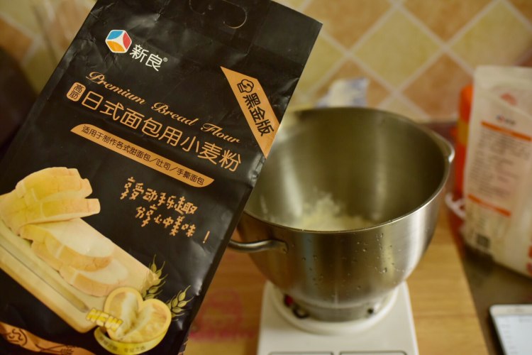 3、倒入日式吐司粉,同樣也可以用其它面包粉。加入酵母粉。