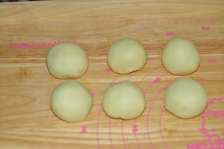 7、取出排氣分成六等份滾圓,蓋上保鮮膜醒15分鍾。
