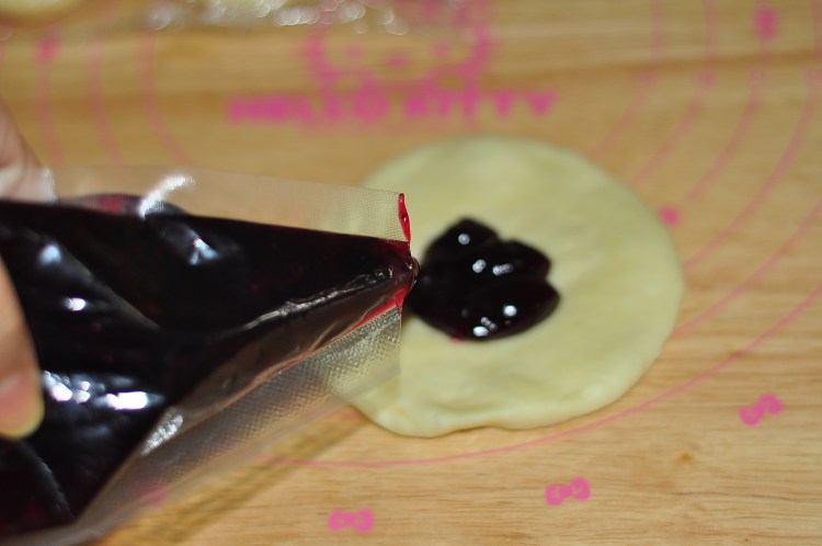 9、取一塊面團壓扁擀圓,擠入一些果醬。