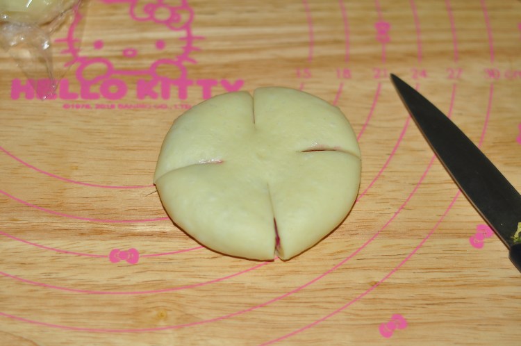 10、捏緊收口朝下按扁,直徑在7、8CM左右。中間用牙簽點個點做記號,然後用小刀平均切成四等份,刀口離牙簽記號有1CM的距離就好。