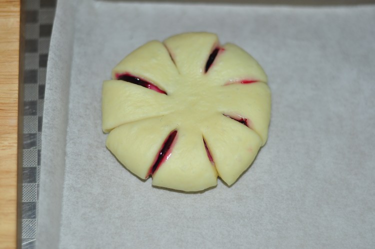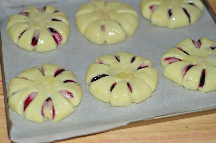 11、然後再將四等份中間分別切開成爲花朵型生胚,擺放在烤盤上。