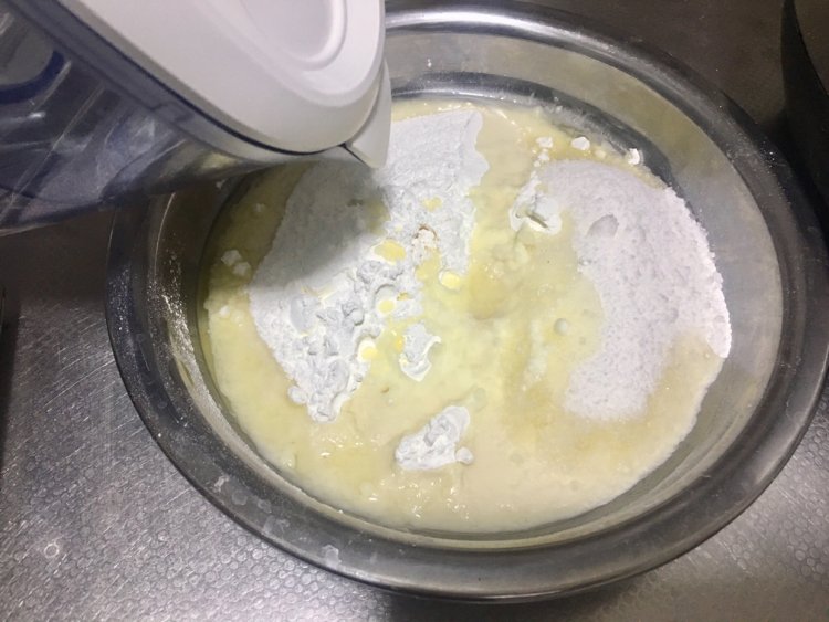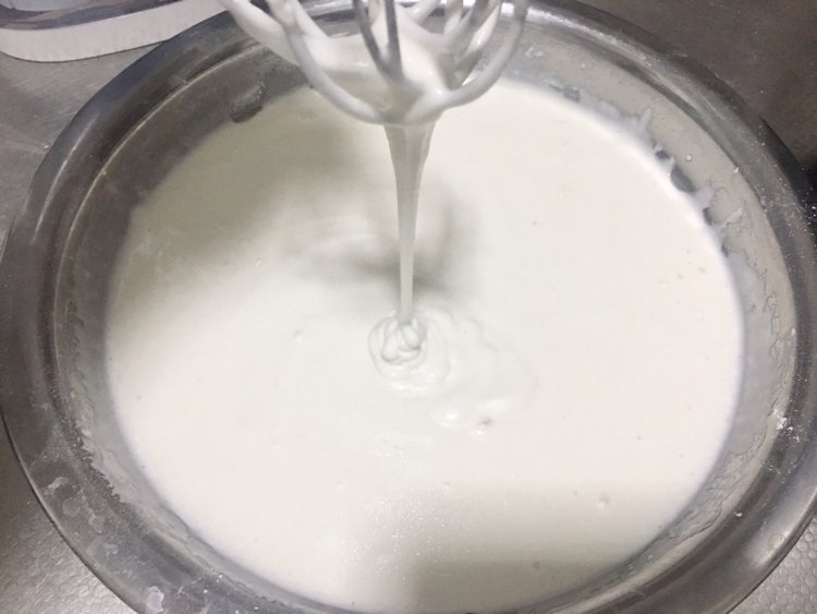 3、用手抽攪拌成順滑的糊狀,提起手抽能連續成線狀。