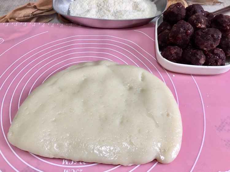 糯米糍外皮Q彈的關鍵步驟是蒸好後反複揉面上勁。
