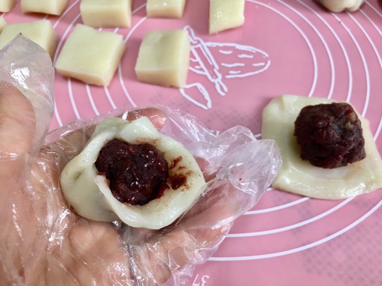 8、戴手套操作,面團下劑每個30克,按成面皮包入豆沙餡兒,收口揉圓。